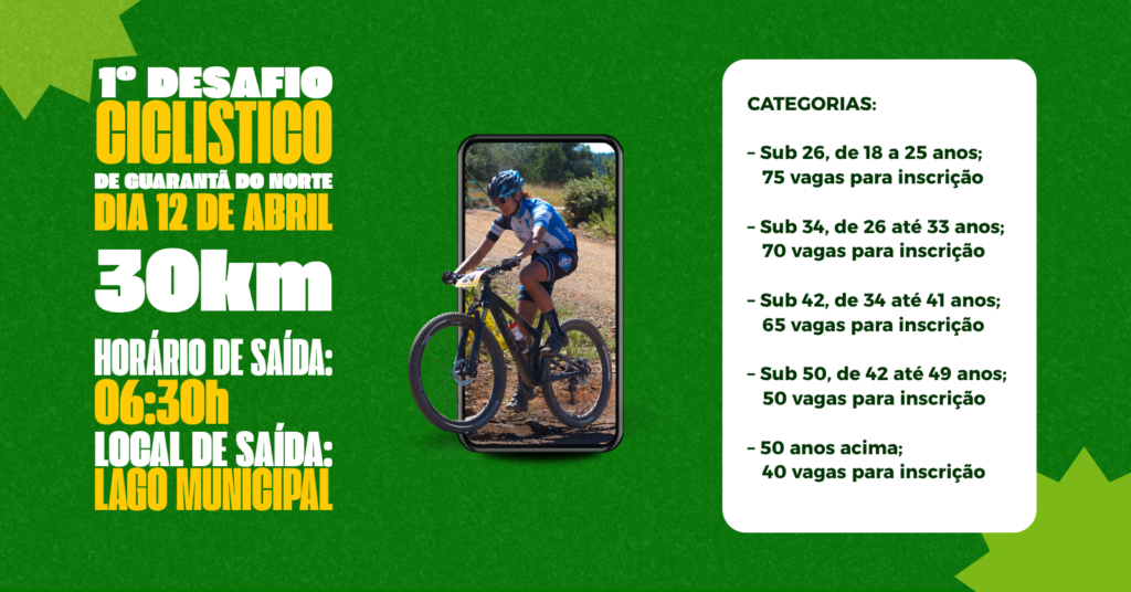 Guarantã do Norte receberá no dia 12 do mês que vem o 1º Desafio Ciclístico, evento esportivo que promete reunir atletas da região em uma prova de resistência com percurso de 30 quilômetros. A largada está prevista para as 6h30, com trajeto que terá início na avenida José Nelson Coutinho, na área central, às margens da BR-163, seguindo pela estrada da Linha 27, passando pela Linha da Páscoa e retornando ao ponto inicial.